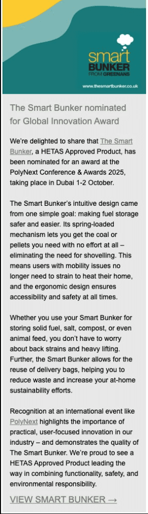 We’re delighted to share that The Smart Bunker, a HETAS Approved Product, has been nominated for an award at the PolyNext Conference & Awards 2025, taking place in Dubai 1-2 October.
